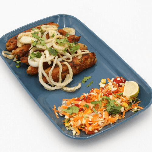 3 Chicken Kebabs, 2 Minced Lamm shammi mixed und gegrillt, serviert mit Salat und Naan